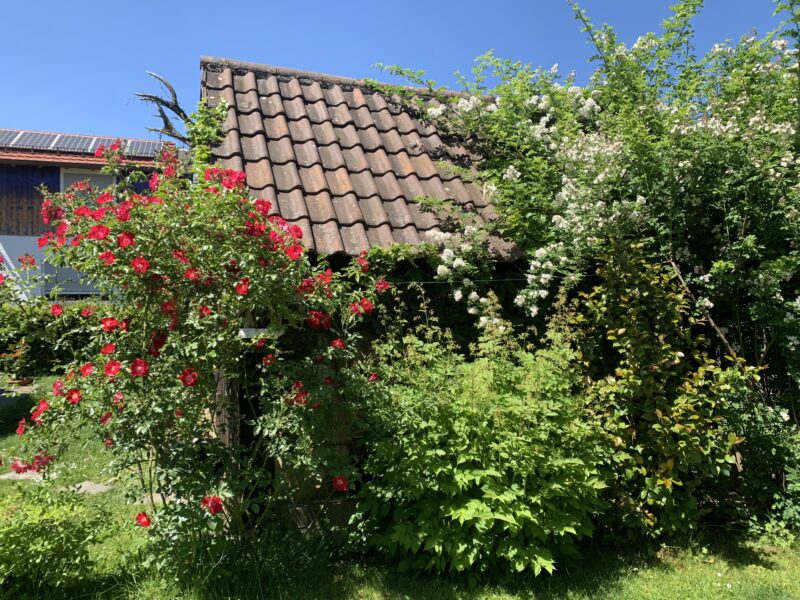 hinter dem Haus ein beeindruckender Garten! Besonders bestechend ein großer Baum in der Mitte, ein kleines Gartenhaus mit vielen Schlupflöchern und eine blühende wilde Wiese über die sich die Holzbienen besonders freuen.