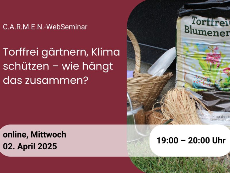 Am Mittwoch, 02.04.2025 findet um 19 Uhr über das C.A.R.M.E.N. (Centrales Agrar-Rohstoff Marketing- und Energie-Netzwerk) ein Webseminar statt, das sich dem Thema widmet: „Torffrei gärtnern, Klima schützen – wie hängt das zusammen?“