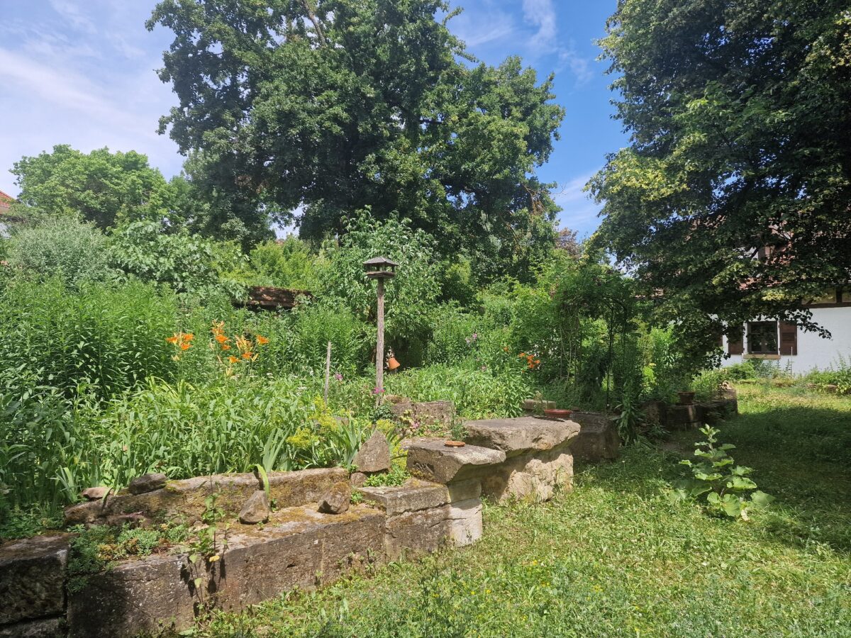 Hier ist ein alter Bestandsgarten in der Umgestaltung von der klassischen Rasenfläche hin zu mehr Vielfalt und kleinen Biotopen. Großen Charme versprüht dabei der alte Baumbestand, in dem sich auch Specht, Blindschleiche und anderes „Getier“. Tolles Beispiel, wie aus dem alten Kindersandkasten mit einfachen Mitteln ein Teich gestaltet werden kann.
