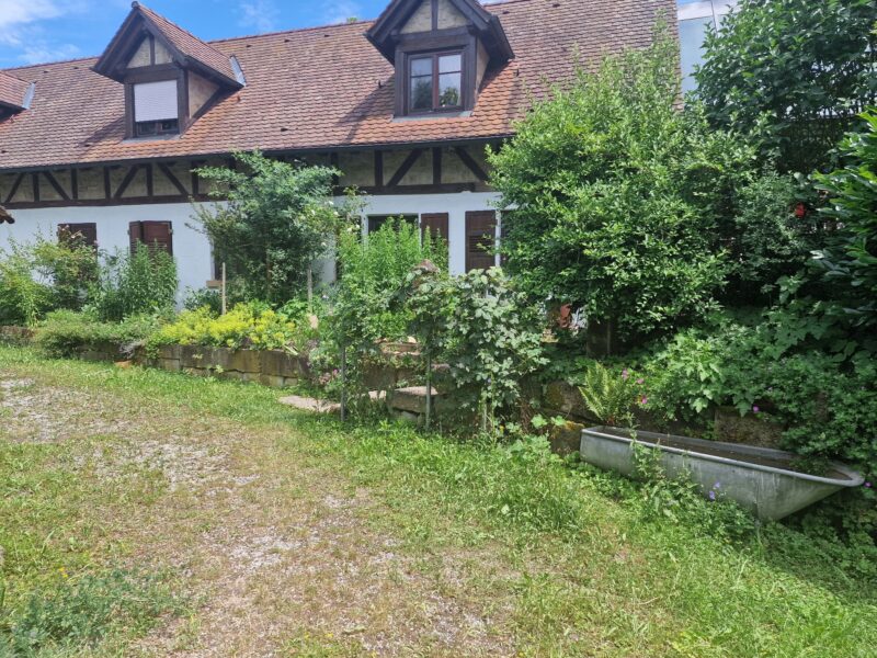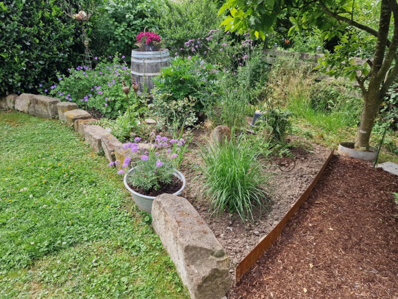 Den Abschluss unserer Vorstellungsrunde bietet dieser Garten. Anschließend an die Kreuzgärten geht der Garten direkt in ein Biotop über. Man merkt deutlich, dass das Gras hier etwas saftiger wächst 🙂 Nach und nach wird die Fläche mit zahlreichen Stauden und Sträuchern bepflanzt, Regenwasser genutzt und ein idyllisches Bild geschaffen. Ein Traum für Insekten und Igel, die hier regelmäßig im Garten ihre Runden drehen.