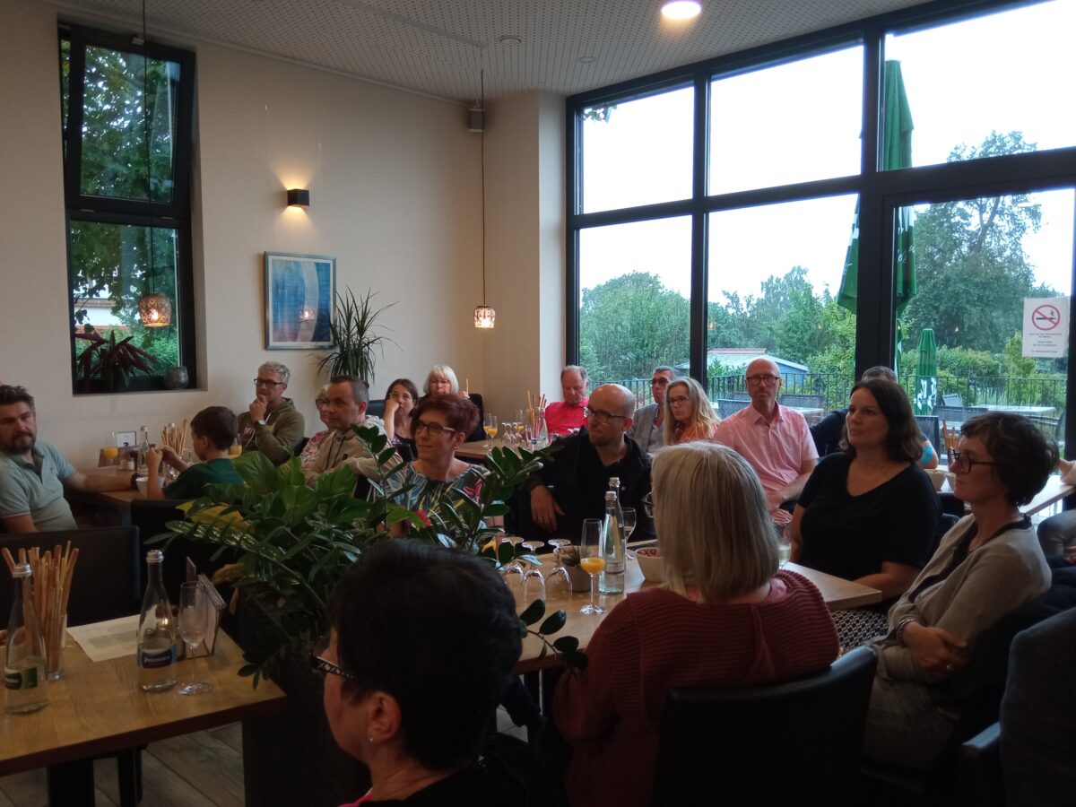 Im Ubstadter Wiesencafé wurden die Ergebnisse bekanntgegeben - während es draußen zur Freude aller Gärtnerinnen und Gärtner ergiebig regnete. Das gemeinsame Abschlussfoto ist deshalb leider "ins Wasser gefallen".