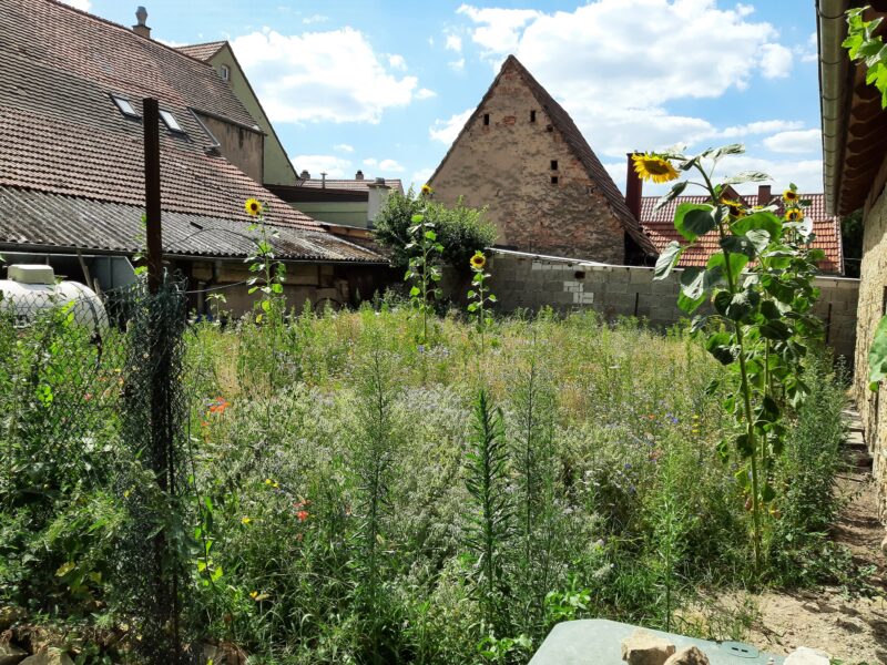 Familie Drach hat vor Jahren in Stettfeld ein historisches Fachwerkhäuschen als Abrissobjekt gekauft - und dann liebevoll restauriert. Im Lehm der Gefache dürfen Wildbienen nisten. Durch den reizvollen Hof und offenen Schuppen mit altem Gebälk gelangt man in einen riesigen Garten, in dessen Zentrum sich ein großzügiger Fußballplatz befindet, der so gar nicht in einen Naturgarten passen würde, wäre er nicht flankiert von Bäumen, Hecken, Steinhaufen, Staudenecken und einem wilden Wiesenstückchen.
