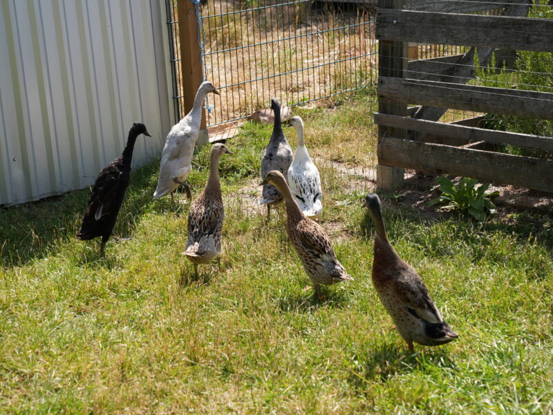 Christa Martus führt ihre Gäste mit spürbarer Freude durch ihren Garten, in dem sie zusammen mit einer Schar von Hühnern und Laufenten lebt. Der Naturteich ohne Folie, nur mit Lehmabdichtung trocknet in den Sommermonaten weitgehend aus, bis auf eine Pfütze, die als Ententränke dient. Nisthilfen, Steinelemente und Resisghaufen sind mit Bedacht angelegt, ebenso die Pflanzbereiche, in denen im Sommer die gelben Korbblüten des echten Alant sowie hier und da bunt gestrichene Fahrräder herausleuchten. Die Fassaden des gemütlichen Schuppens sind mit wildem Wein begrünt - ein Paradies für Menschen, Haus- und Wildtiere!